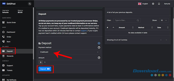 Nhập số 1 tương ứng với 1$ nạp tiền vào tài khoản SMSPool và nhấn nút Deposit.