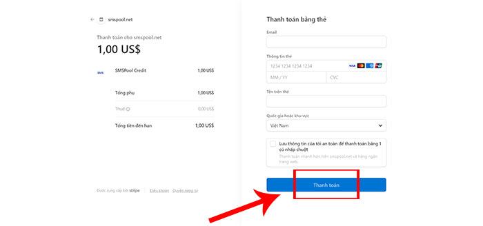 Bước 3: Điền thông tin thẻ tín dụng được yêu cầu và nhấn nút Thanh toán. Đây sẽ là phí để mọi người mua số điện thoại ảo tại Mỹ.