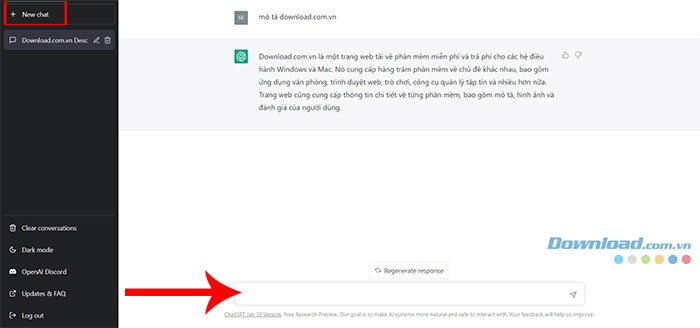 Bước 6: Sau khi đăng nhập thành công vào ChatGPT, nhấn vào New Chat, nhập nội dung câu hỏi, thắc mắc hay bất kỳ điều gì vào ô trống để trò chuyện với chatbot AI - ChatGPT.