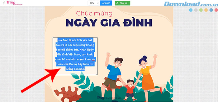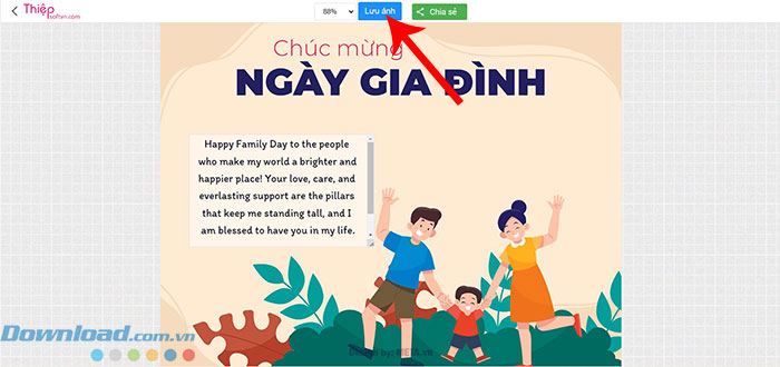 Lựa chọn một mẫu thiệp Ngày Gia đình Việt Nam được cung cấp phía trên > nhập lời chúc, lời cảm ơn vào phần trống của thiệp > nhấn nút Lưu ảnh > nhấn Save để tải thiệp điện tử về thiết bị