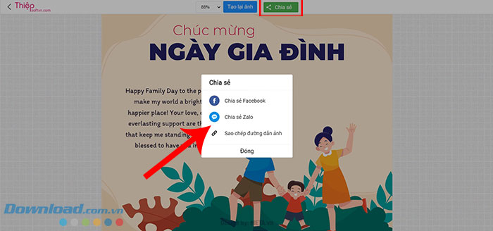 Bước 4: Ngoài ra, để nhanh chóng gửi thiệp tới các thành viên trong gia đình, mọi người có thể chọn Chia sẻ để gửi thiệp qua Zalo hoặc Facebook cho người thân.
