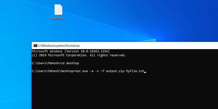 Nhập lệnh tar.exe -a -c -f output.zip myfile.txt vào cửa sổ Command Prompt. Thay thế output.zip bằng tên muốn đặt cho tệp ZIP và myfile.txt bằng tệp muốn thêm vào ZIP và nhấn Enter.