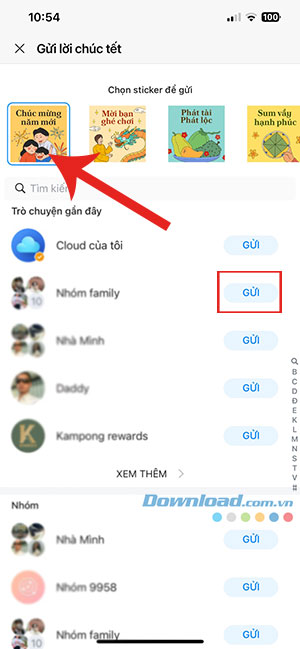 Mở Zalo trên thiết bị > nhấn vào Chọn sticker chúc trên banner Gửi sticker Giáp Thìn > chạm giữ để xem qua các mẫu sticker chúc Tết > chạm để chọn 1 sticker > nhấn nút Gửi bên cạnh tên người nhận.
