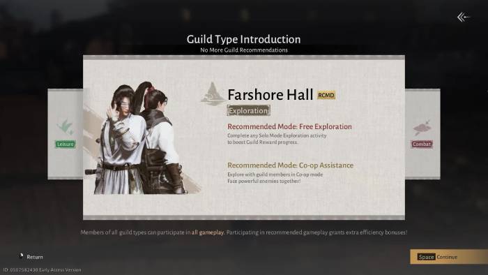 Khi nhấn vào nút Guild trong menu tạm dừng (biểu tượng lá cờ), game thủ được giới thiệu về hệ thống Guild. Where Winds Meet có 3 loại bang hội, mỗi loại được phân chia dựa trên phong cách chơi mà game thủ hướng đến: