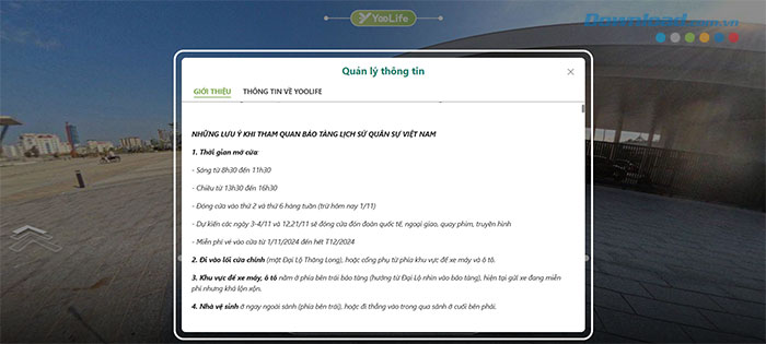 Hiện Bảo tàng Lịch sử Quân sự Việt Nam đang thu hút sự quan tâm nồng nhiệt của người dân, với hàng chục nghìn lượt người tới tham quan. Đối với những người không có điều kiện tới tham quan bảo tàng trực tiếp, nền tảng YooLife đã phát triển sản phẩm Bảo tàng ảo giúp người dùng khám phá toàn bộ các khu vực, hiện vật tại bảo tàng trực tuyến trên mọi thiết bị.