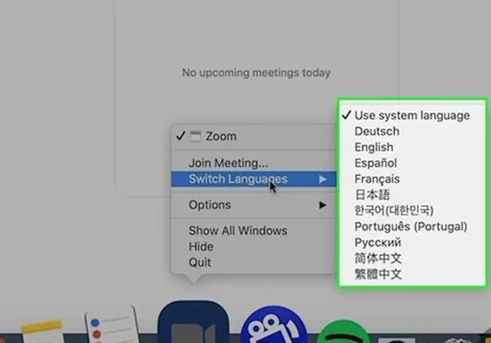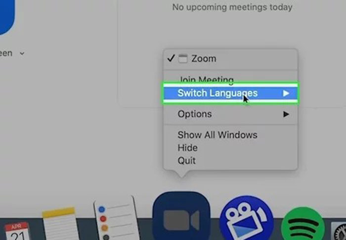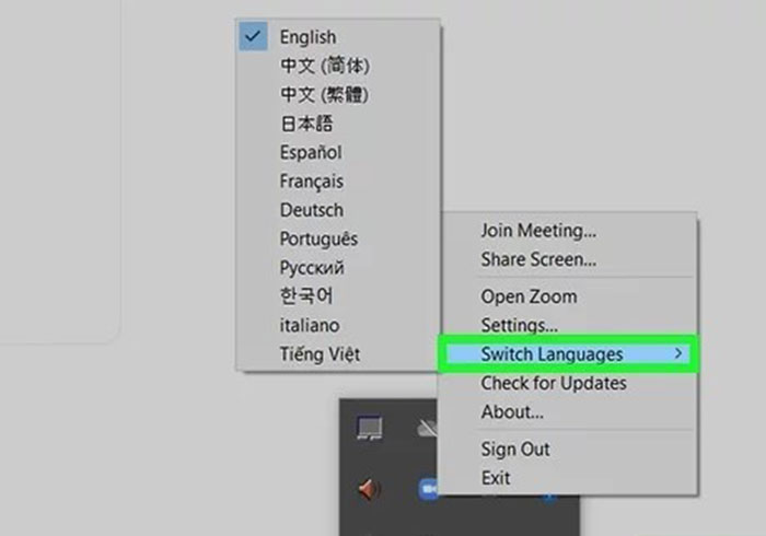 Bước 2: Nhấn chuột phải vào biểu tượng Zoom. Chọn Switch Languages và danh sách ngôn ngữ sẽ xuất hiện.