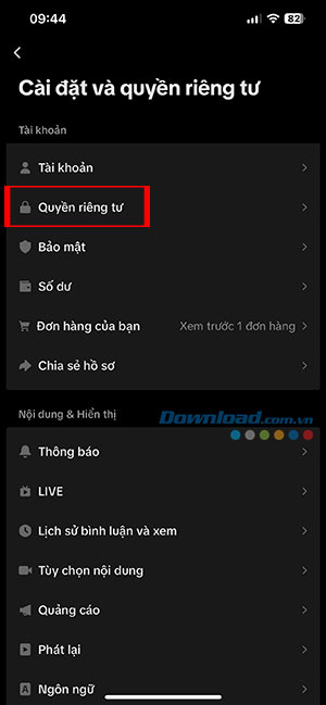 Bước 3: Trong danh mục các cài đặt, chọn Quyền riêng tư ở mục Tài khoản.