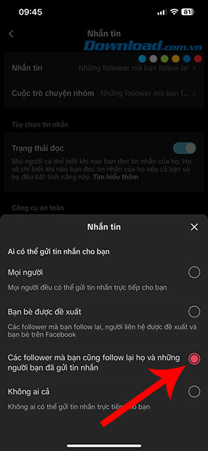Bước 5: Cài đặt người có thể nhắn tin mặc định là Mọi người. Để thay đổi người có thể nhắn tin cho mình, chuyển sang Các follower mà bạn cũng follow lại họ và những người bạn đã gửi tin nhắn, Bạn bè được đề xuất để chỉ những người thật sự quen biết mới có thể kết nối với bạn.