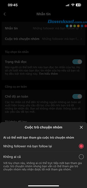 Ngoài ra, mọi người cũng có thể chọn Ai có thể mời bạn tham gia trò chuyện nhóm bằng cách chạm vào Cuộc trò chuyện nhóm và chọn Những follower mà bạn follow lại hoặc Không ai cả.