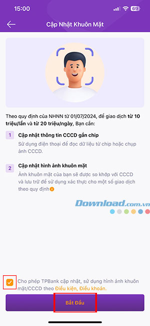 Bước 2: Cho phép TPBank cập nhật, sử dụng hình ảnh khuôn mặt/CCCD và nhấn Bắt đầu.