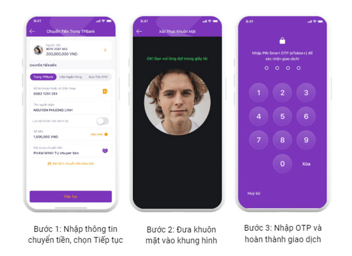 Mọi người chỉ cần thiết lập sinh trắc học khuôn mặt 1 lần duy nhất. Sau đó, ứng dụng sẽ tự động yêu cầu xác thực khuôn mặt với các giao dịch cần thiết như sau: