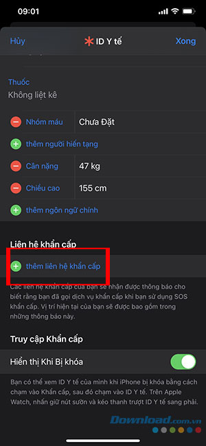 Mở ứng dụng Sức khỏe > nhấn vào ảnh hồ sơ người dùng > ID y tế > Bắt đầu > thêm liên hệ khẩn cấp > chọn một liên hệ có sẵn trong danh bạ > chọn mối quan hệ > nhấn nút Xong.