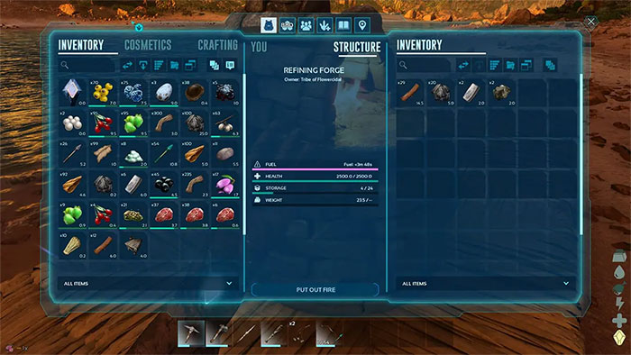 Bây giờ, hãy vào kho đồ với tất cả tài nguyên và chuyển sang menu Crafting. Từ đây, người chơi có thể chế tạo Refining Forge và đặt nó vào thế giới bằng cách nhấn phím E.