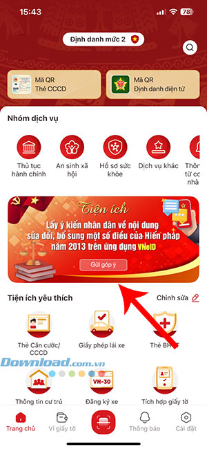 Tại trang chủ, nhấn vào Tiện ích lấy ý kiến nhân dân về nội dung sửa đổi, bổ sung Hiến pháp năm 2013 trên ứng dụng VNeID.