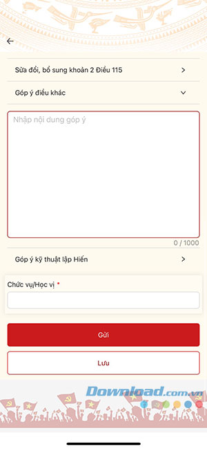 Mọi người cũng có thể chọn Góp ý điều khác nếu có nội dung góp ý các điều khác ngoài danh sách, hoặc Góp ý kỹ thuật lập Hiến nếu góp ý về mặt kỹ thuật văn bản. Sau đó, nhập nội dung góp ý, điền Chức vụ/Học vị và nhấn nút Gửi.