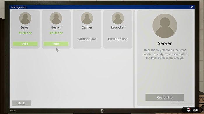 - Để thuê một nhân viên với vai trò mình muốn, người chơi cần nhấn nút Hire bên cạnh người đó. Mọi người cần trả cho mỗi nhân viên 2,5 đô la trên một giờ làm việc của họ.