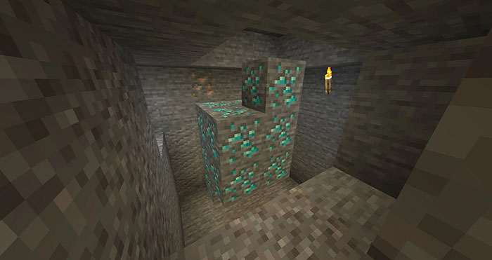 Kim cương trông khá giống với Redstone. Nó bắt đầu tạo ở layer 16 và đi xuống tận Bedrock. Nó cũng trở nên phổ biến hơn khi đi sâu vào, mặc dù không nhiều như Redstone. Layer tốt nhất để tìm nó là -59 để tránh Bedrock cản đường. Những người may mắn thậm chí có thể thấy nó hiện rõ trên tường trong các hang động mới.