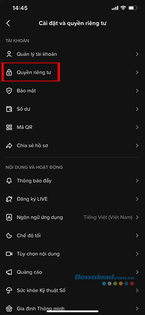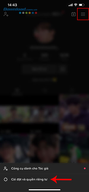 Bước 1: Chuyển đến tab Hồ sơ và nhấn vào ba dấu gạch ngang ở góc trên cùng bên phải. Sau đó chọn Cài đặt và Quyền riêng tư.