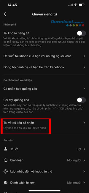 Bước 3: Nhấn vào Tải về dữ liệu cá nhân.