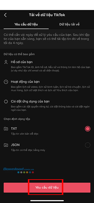 Sau khi thực hiện xong, mọi người có thể kiểm tra yêu cầu dữ liệu đang chờ xử lý của mình trong tab Dữ liệu tải về ở cùng trang Tải về dữ liệu TikTok.