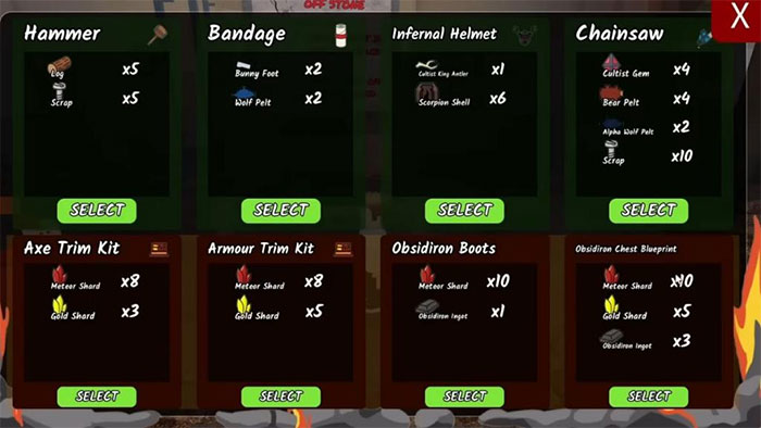 | Chainsaw | 4 Cultist Gem 4 Bear Pelt 2 Alpha Wolf Pelt 10 Scrap | Chặt cây và gây sát thương lên sinh vật |