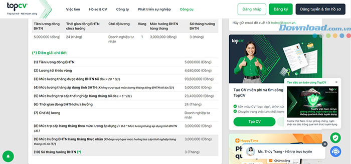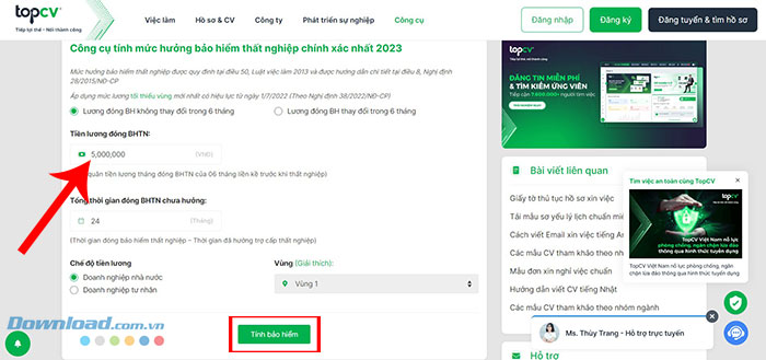 Bước 1: Truy cập Công cụ tính mức hưởng bảo hiểm thất nghiệp chính xác nhất 2023 trên TopCV.