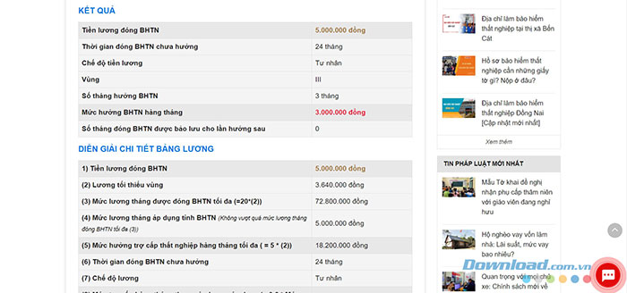 Bước 3: Sau khi nhấn nút Tính bảo hiểm, kết quả chi tiết sẽ được bên dưới để mọi người nắm được mức hưởng BHTN của mình.