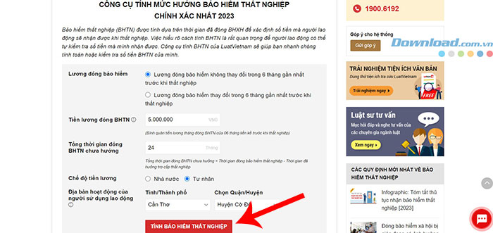 Bước 1: Truy cập Công cụ tính mức hưởng bảo hiểm thất nghiệp chính xác nhất 2023 do LuatVietNam.vn cung cấp