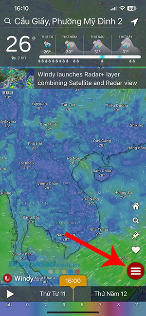 Tải xuống Windy cho thiết bị đang sử dụng và nhấn vào ba dấu gạch ngang màu đỏ ở góc dưới cùng bên phải giao diện chính.