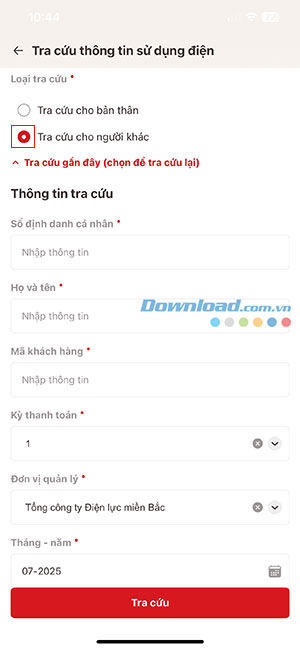 Nếu chọn Tra cứu cho người khác, mọi người cần điền chính xác các thông tin của chủ hợp đồng sử dụng điện, bao gồm số định danh cá nhân, họ tên, mã khách hàng (có thể xem mã khách hàng trên tin nhắn báo tiền điện hoặc giấy báo tiền điện được gửi đến).
