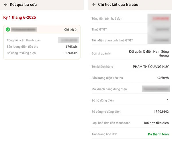 Sau khi hoàn tất và nhấn Tra cứu, ứng dụng VNeID sẽ hiển thị sản lượng điện đã tiêu thụ, số công tơ dùng điện và số tiền điện đã thanh toán theo tháng. Người dùng có thể nhấn nút Chi tiết để toàn bộ các thông tin về lượng điện tiêu thụ của tháng.
