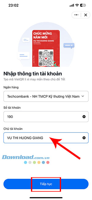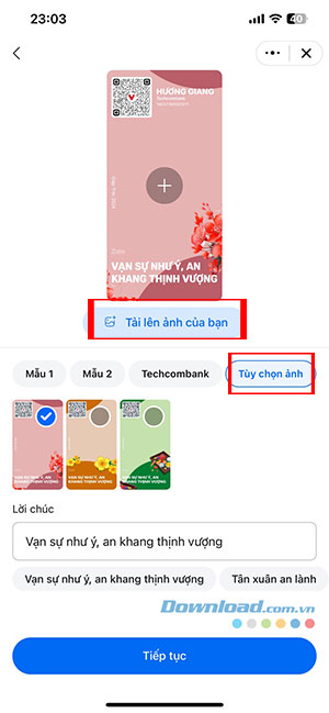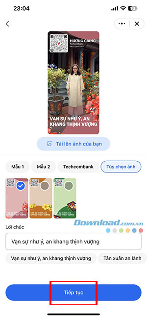 Bước 4: Sau khi đã ưng ý với mẫu trang trí và lời chúc cho QR Tết, hãy ấn nút Tiếp tục.