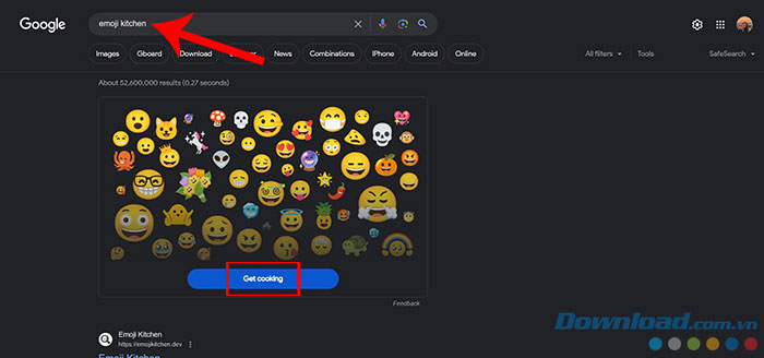 Bước 2: Tìm kiếm Emoji Kitchen và nhấn nút Nấu ăn.
