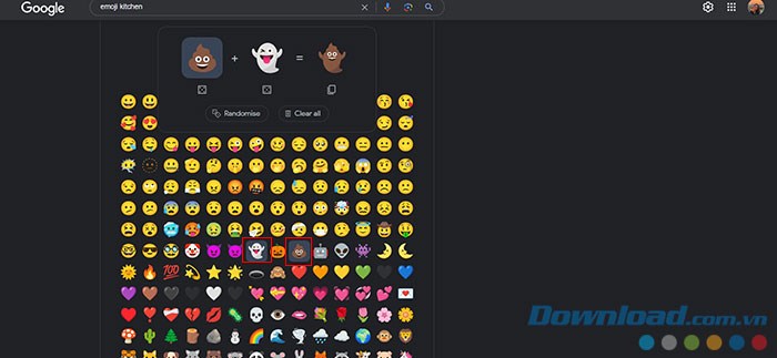 Bước 3: Chọn 2 biểu tượng cảm xúc từ danh sách gần 130 biểu tượng cảm xúc của Emoji Kitchen. Kết quả emoji mới sẽ được hiển thị và người dùng có thể kết hợp để tạo ra hơn 800 biểu tượng emoji mới.