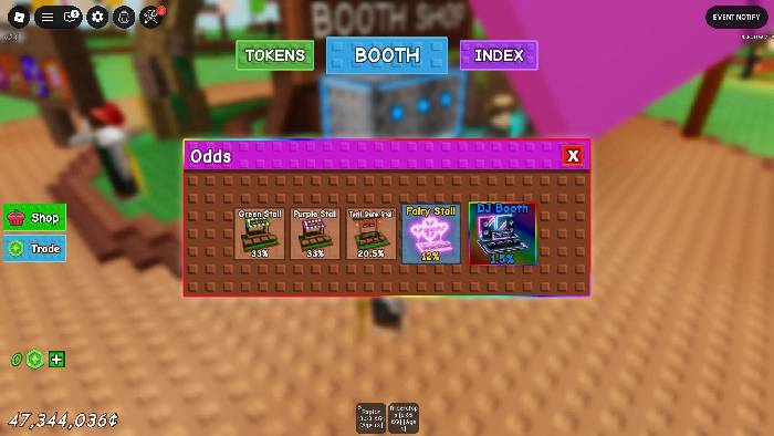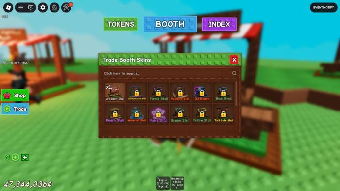 Sau mỗi lần quay, mọi người sẽ nhận được 1 trong 10 skin Booth và có thể áp dụng nó cho gian hàng của mình. Hãy đến Trade Booth của mình và tương tác để mở menu tùy chỉnh. Chọn skin muốn áp dụng và skin mới sẽ hiển thị cho tất cả người chơi trong server.