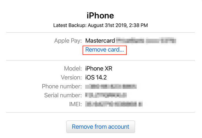 Từ trang web Apple ID, người dùng có thể xóa các thẻ được liên kết với Apple Pay mà không cần bật Chế độ mất. Điều này có nghĩa là người dùng không phải liên hệ với công ty phát hành thẻ của mình để tạm ngưng thẻ khỏi Apple Pay.