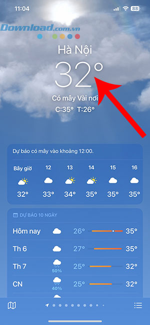 Mở ứng dụng Apple Weather trên iPhone, ở đầu màn hình chính của ứng dụng, mọi người sẽ thấy nhiệt độ hiện tại, nhiệt độ cao và thấp nhất được dự đoán trong ngày.
