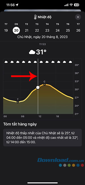 Bước 2: Nhấn giữ vào bất kỳ đâu trên biểu đồ và di chuyển ngón tay sang phải hoặc trái để hiển thị nhiệt độ dự kiến trong 24 giờ của ngày hôm đó.