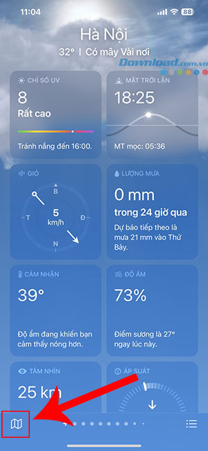 Bước 1: Nhấn vào biểu tượng bản đồ ở góc dưới bên trái của ứng dụng Thời tiết.