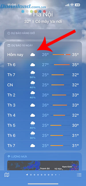 Tiếp theo, mọi người sẽ thấy Dự báo 10 ngày, trong đó là nhiệt độ tối thiểu (trái) và tối đa (phải) dự kiến của mỗi ngày. Biểu tượng bên cạnh ngày thể hiện khả năng có mưa.
