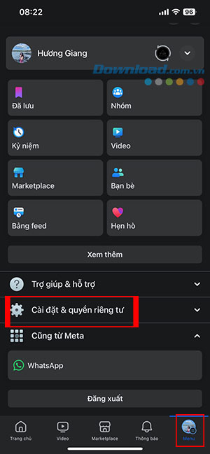 Bước 1: Nhấn vào tab Menu (biểu tượng avatar người dùng hoặc ba dấu gạch ngang) trên thanh công cụ, nằm ở góc dưới cùng bên phải. Sau đó, chọn Cài đặt & quyền riêng tư.