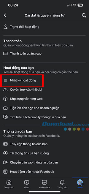 Bước 3: Lướt xuống phần Hoạt động của bạn và chọn Nhật ký hoạt động.