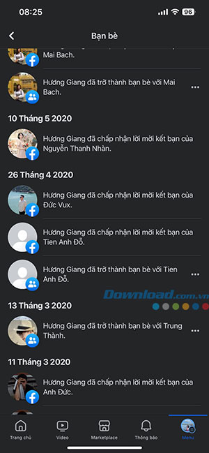 Bước 5: Tại đây, mọi hoạt động mọi người đã làm liên quan tới bạn bè sẽ xuất hiện. Người dùng có thể xem ngày trở thành bạn bè, thời gian đã chấp nhận lời mời kết bạn của ai đó trên Facebook.