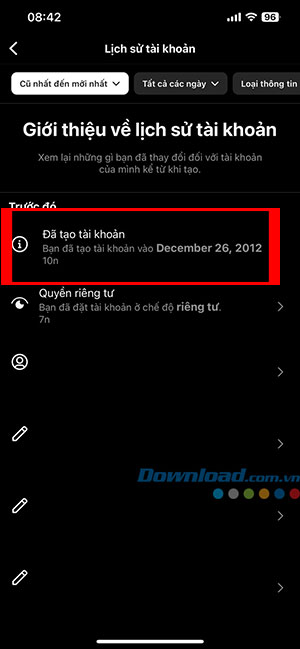 Sau khi thay đổi sắp xếp dòng thời gian các sự kiện, mọi người sẽ thấy sự kiện đầu tiên là Đã tạo tài khoản kèm theo chính xác ngày tạo tài khoản Instagram. Ví dụ: Bạn đã tạo tài khoản vào December 26, 2012; tức là tài khoản Instagram của mọi người được tạo vào 26/12/2012.