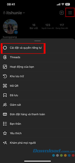 Bước 1: Khởi chạy ứng dụng Instagram và truy cập trang hồ sơ cá nhân. Nhấn vào biểu tượng ba dấu gạch ngang ở góc trên bên phải.