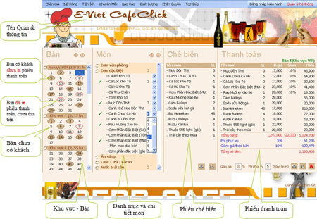 Quản lý khu vực – bàn, lập phiếu chế biến, xử lý thêm món, trả món, đổi món, tính tiền giờ, lập phiếu thanh toán, chuyển bàn, gộp bàn.