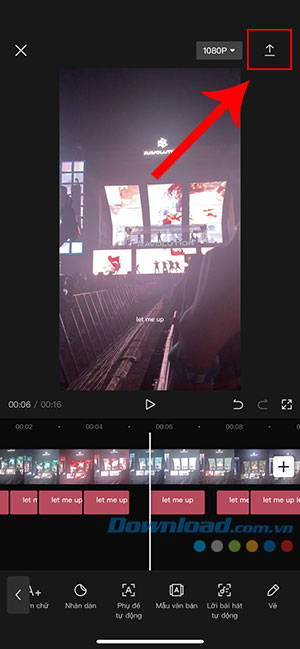 Bước 6: Khi đã hoàn thành chỉnh sửa phụ đề cho khớp thời gian và nội dung chính xác, hãy nhấn vào mũi tên ở góc trên cùng bên phải để xuất video vào Thư viện Ảnh của thiết bị.