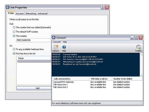 Carousel là phần mềm cho phép kết nối các cuộc gọi VoIP đến các đường điện thoại thông thường và ngược lại bằng cách sử dụng một trong số các thiết bị điện thoại chuyên nghiệp. Nó làm việc như một FXO gateway ảo. Bạn có thể cài đặt nó như một dịch vụ trên bất cứ máy tính Windows nào. Các cuộc gọi sẽ được chuyển hướng sang các đường điện thoại tương tự PSTN qua một bảng mạch điện thoại.