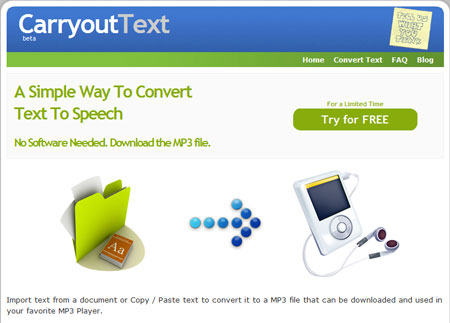 Nếu bạn không phải là một fan hâm mộ lớn của việc đọc sách hay tài liệu, bởi việc đọc tài liệu lâu có thể làm bạn mỏi mắt. Vậy bạn hãy thử chuyển đổi các bài viết sang một tập tin âm thanh để bạn có thể nghe trên điện thoại, trên máy tính, iPod hoặc bất kỳ công cụ nghe nhạc MP3 nào. CarryOutText là một công cụ đơn giản cho phép bạn chuyển đổi văn bản sang định dạng âm thanh chuẩn mp3 âm thanh chỉ trong 2 bước đơn giản.