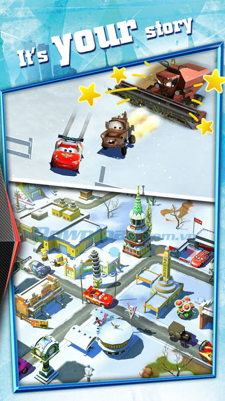 Để có thêm tiền vàng và kim cương - đơn vị tiền tệ chính trong game, bạn có thể xem video quảng cáo, mua bằng tiền thật nhưng cách thú vị nhất là chơi các trò chơi phụ, chẳng hạn như xây dựng đường đua Radiator Springs 3D của riêng mình, xây nhà cho Lightning và những người bạn khác.